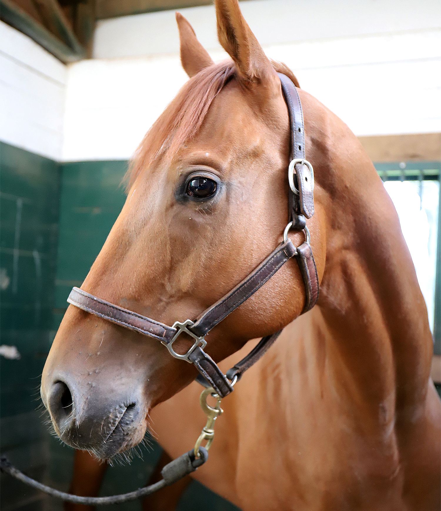16 hands. He last raced on 5/15/25 and retired with left front fetlock arthritis and suspensory desmitis and a left front suspensory tear. He has had surgery in the past for a condylar fracture and there are 2 screws in the leg. He is currently on stall until 12/11. He is doing well.  He will be ready for round pen or very small paddock turnout on 12/12.